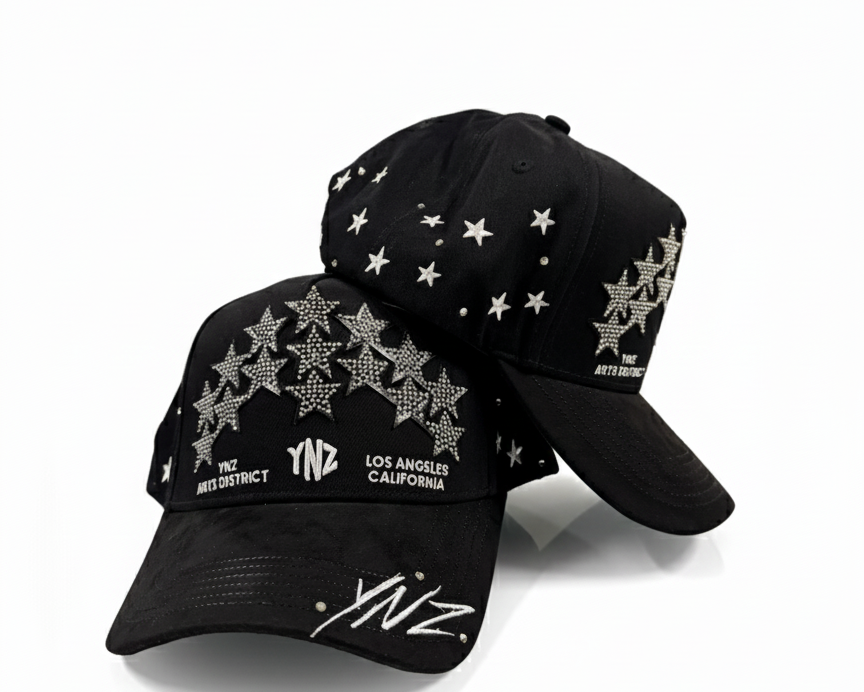 Crafted with premium materials, this black cap features a spectacular display of brilliant rhinestones shaped into a bold arch of stars across the crown. The unique arrangement ensures you capture the light and attention everywhere you go.